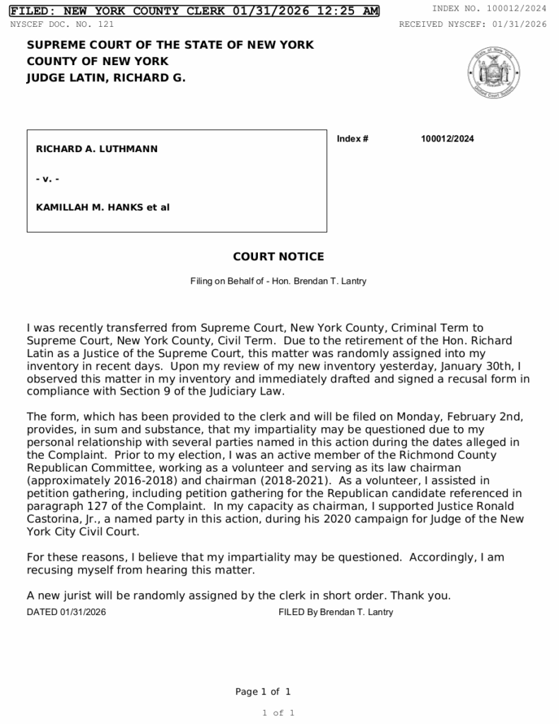 In a system that rewards silence, complicity, and corruption, Lantry’s recent recusal in my case against Kamillah Hanks, Kevin Barry Love, Ron Castorina, and others wasn’t just correct. It was judicious and smart.