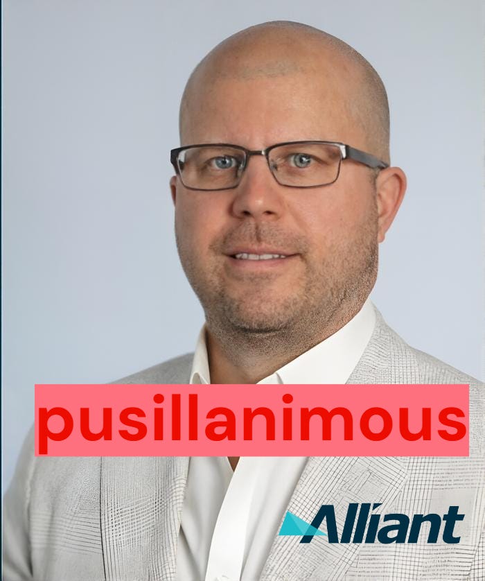 This media inquiry is made to provide Alliant opportunity to comment on what is an article covering highly paid executives who abuse mothers and children for no rational purpose, destruction of familial bonds to feed what is suspected to be organic mental disorders, where in the transparent, ultra connected society of today the public holds curiosity as to why a company such as Alliant expects customers to trust a business line run by a man who relishes in inflicting intentional emotional harm to his own children and their mother. A human interest story with a business twist, highlighting a male dominated corporate ladder who vette new hires with such known backgrounds.