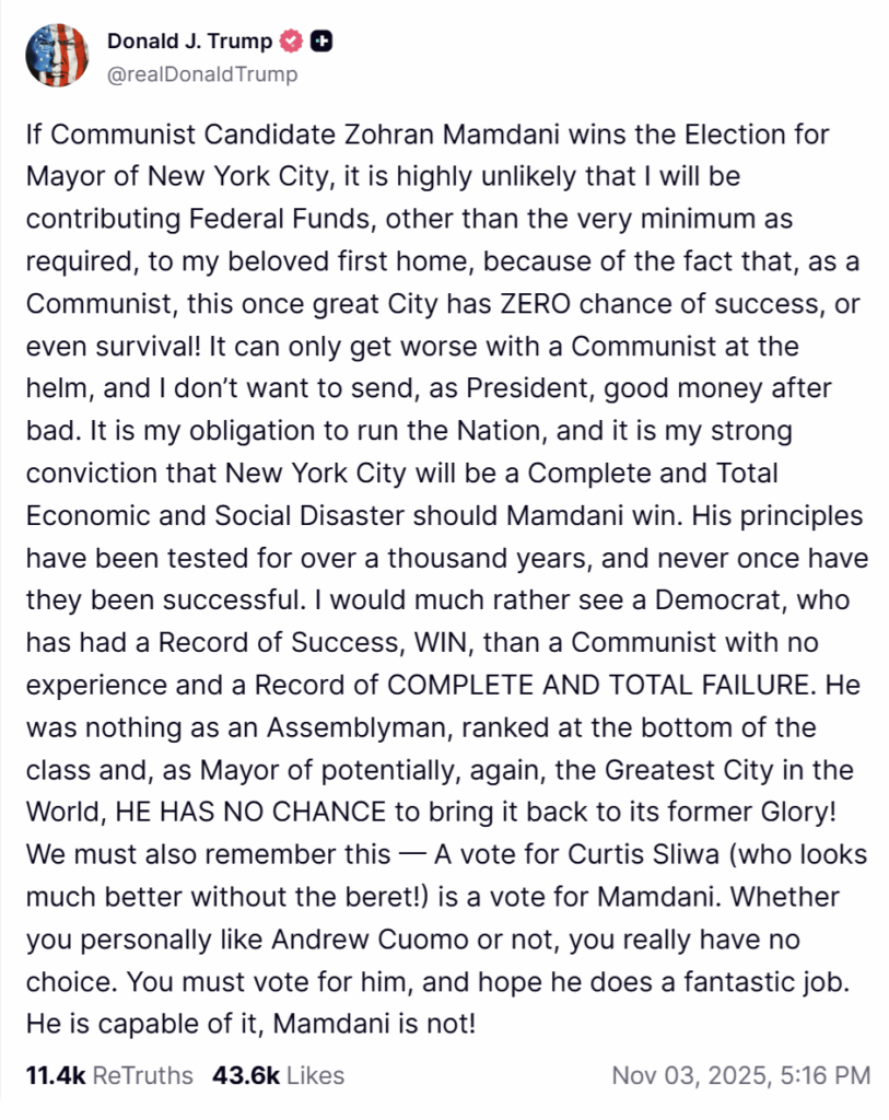 President Trump and Republicans wasted no time weaponizing the Democrats’ leftward march. Even before Election Day, Mr. Trump blasted Zohran Mamdani as a “Communist” and warned he would withhold federal funds from New York City if the socialist won. In a fiery Truth Social post, the president declared that under a “Communist” mayor, the city would have “ZERO chance of success” and face “complete and total disaster.”