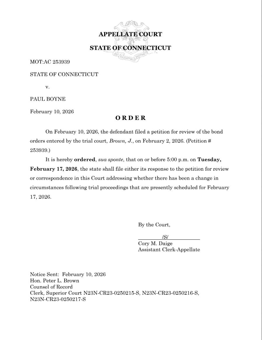 Boyne’s release came at an unscheduled hearing on Tuesday, Feb. 17, 2026, in New Haven. Judge Brown convened the session on short notice and dropped Boyne’s bond back to its prior level, effectively undoing the $1.5 million bail increase he imposed two weeks earlier.