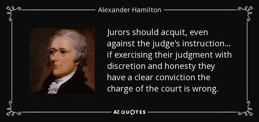 This is the “palladium of liberty” that America’s founders envisioned. Jurors judging both the facts and the law form a final bulwark against tyranny. “Even one juror” can stand up and hang a jury if convicting would be a miscarriage of justice.