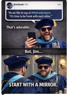 Bought TheFrankReport.com to impersonate FrankReport.com. (Let me be clear: he did not buy my site, FrankReport.com.)