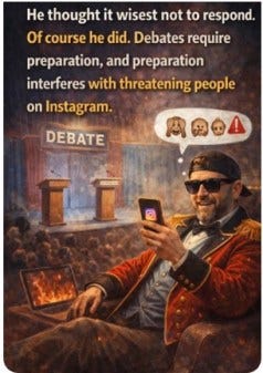 He thought it wisest not to respond. Of course he did. Debates require preparation, and preparation interferes with threatening people on Instagram.
