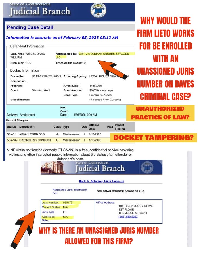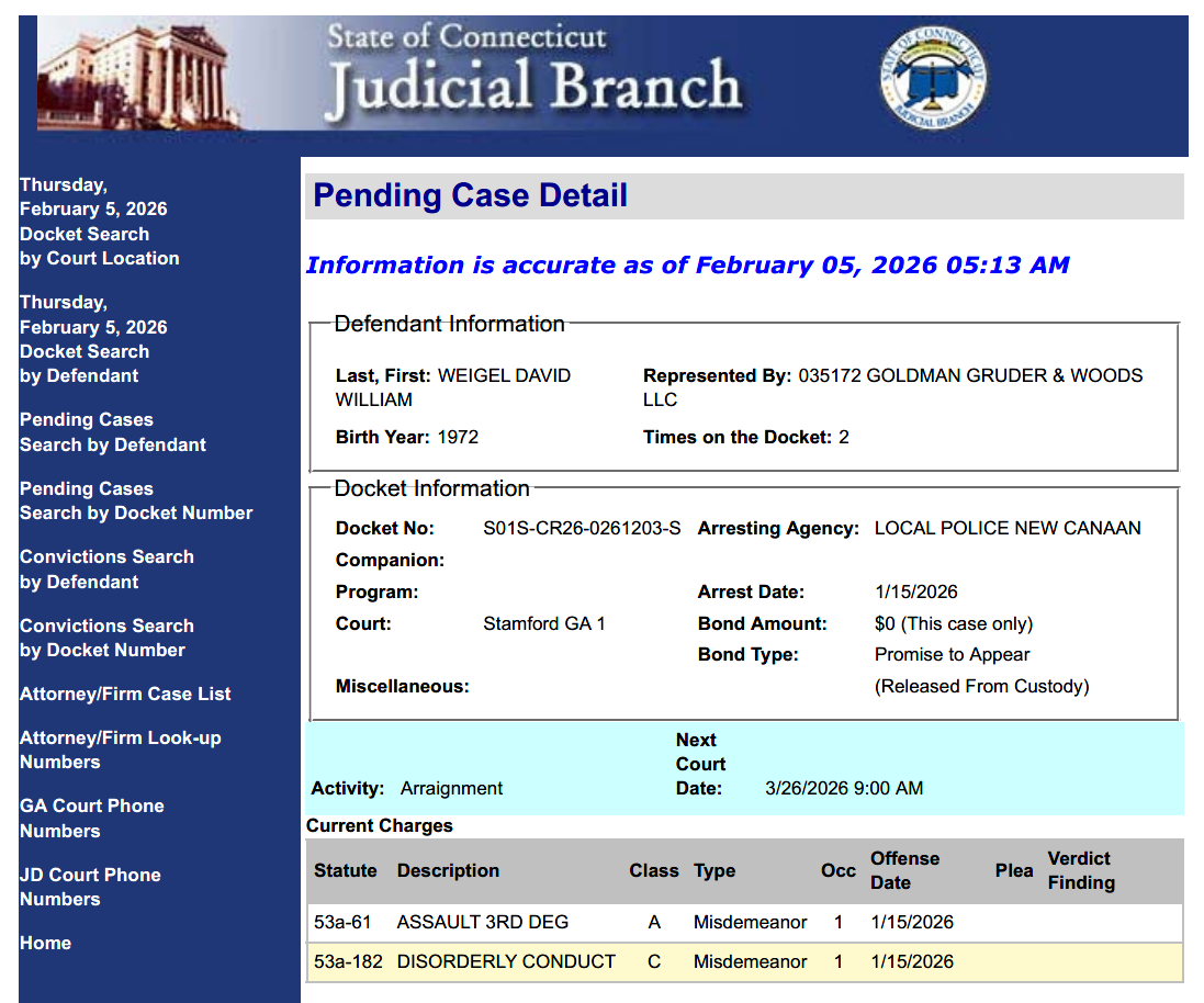 Even the Connecticut Judiciary’s docket shows signs of dishonesty, misrepresentation, and tampering. How is it that Carlos and Zoali Alvarez’s “crooked” lawyers purportedly represent David Weigel in a suspiciously laid criminal case based on a “non-arrest”?