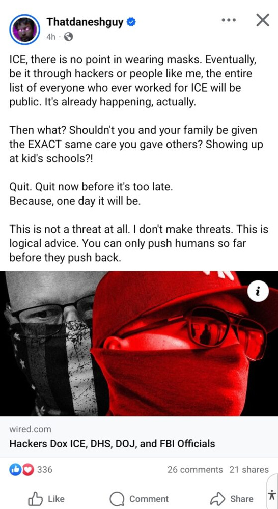 Noshirvan’s militancy isn’t limited to fantasies about militias. He has directly threatened ICE personnel and their families. In one chilling Facebook post, he warned agents that hiding their identities is futile – vowing that “people like me” will expose “the entire list of everyone who ever worked for ICE”. “Then what?” Noshirvan taunted. “Shouldn’t you and your family be given the EXACT same care you gave others?…Quit now before it’s too late.”