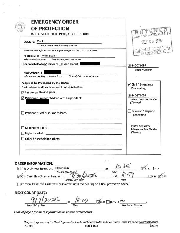 But Cook County doesn’t protect children—it protects abusers. When the reunification scheme failed, Morgan switched to the infamous “silver bullet” strategy. She ran ex parte to Judge O’Donnell, who, on September 5, 2025, signed an Emergency Order of Protection in Spear’s favor.