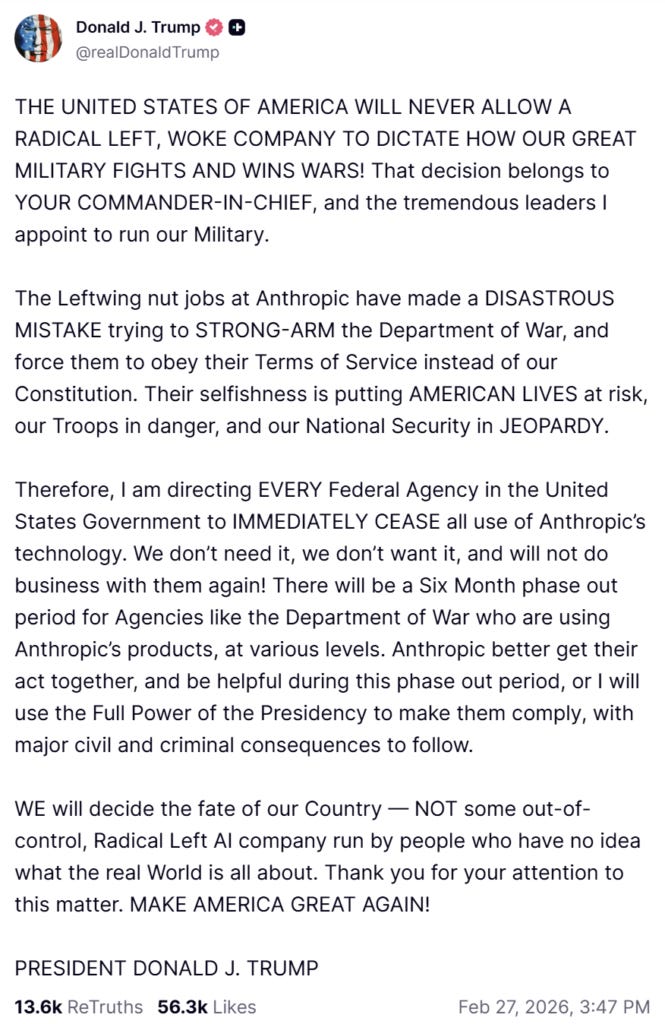 Trump said, “WE will decide the fate of our Country — NOT some out-of-control, Radical Left AI company.” Message received.