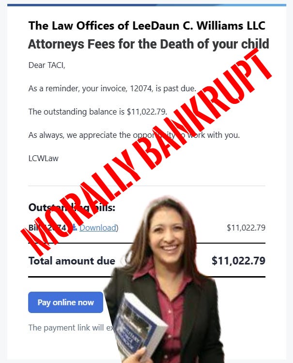 For a fee, LeeDaun Williams aids and abets judicial homicide of minors (mainly through incompetence and retardation). More on that below.