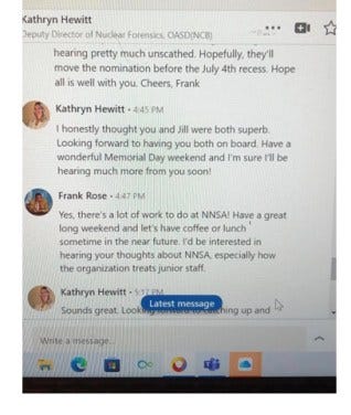 According to Rose’s complaint, Deborah Rosenblum, Assistant Secretary of Defense for Nuclear, Chemical, and Biological Affairs, “specifically confirmed to NNSA Administrator Jill Hruby that Hewitt had spoken to the media without authorization.”