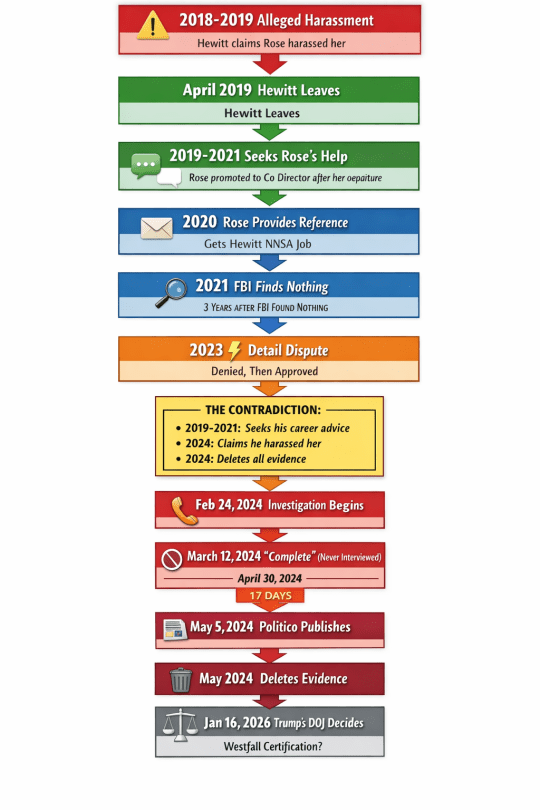 August 2021 – 2023: Both work at NNSA—Rose as Principal Deputy Administrator, Hewitt in Communications/Public Affairs. Rose states he never communicated with Hewitt during this period.