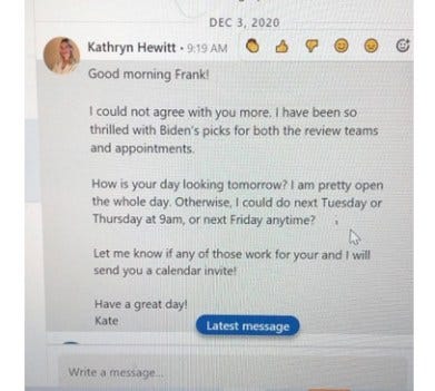 Here is a sampling of some of the LinkedIn texts Kathryn Hewitt sent to Frank Rose, after she left Brookings, where she claimed he had sexually harassed her. She deleted these texts after she gave her Politico interview. Note: BlueJeans was a cloud-based video conferencing platform, similar in purpose to FaceTime, but aimed more at business and enterprise use.