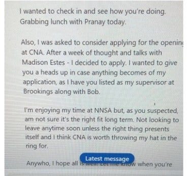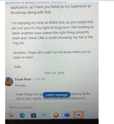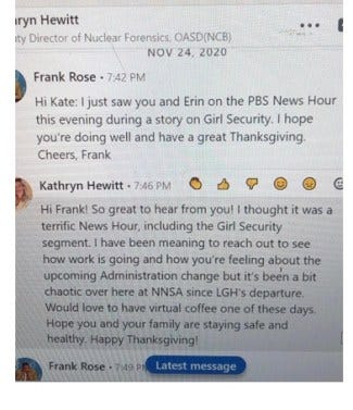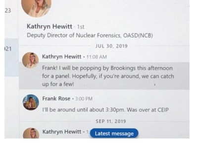 More tellingly, Rose was promoted to Co-Director at Brookings following Hewitt’s departure in April 2019. During his tenure at NNSA, Brookings invited him back for presentations and discussed his potential return.