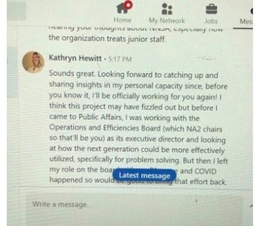 Over the next two years, Hewitt and Rose communicated via LinkedIn messages. After speaking to Politico in 2024, Hewitt deleted all those messages along with her entire LinkedIn account.