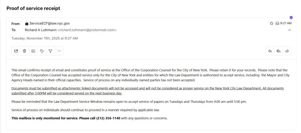 The NYC Law Department has already confirmed receipt of the Luthmann letter. The communication in full is below.