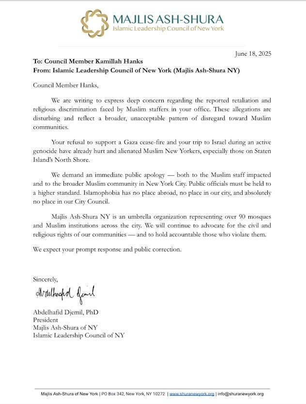 Richard Luthmann, “Kamillah Hanks Islamophobia Outrage: Immediate Backlash to Anti-Muslim Threats,” NY News Press (July 2025) luthmann.substack.com (covering the Islamophobia scandal and lack of action by DA McMahon’s office).