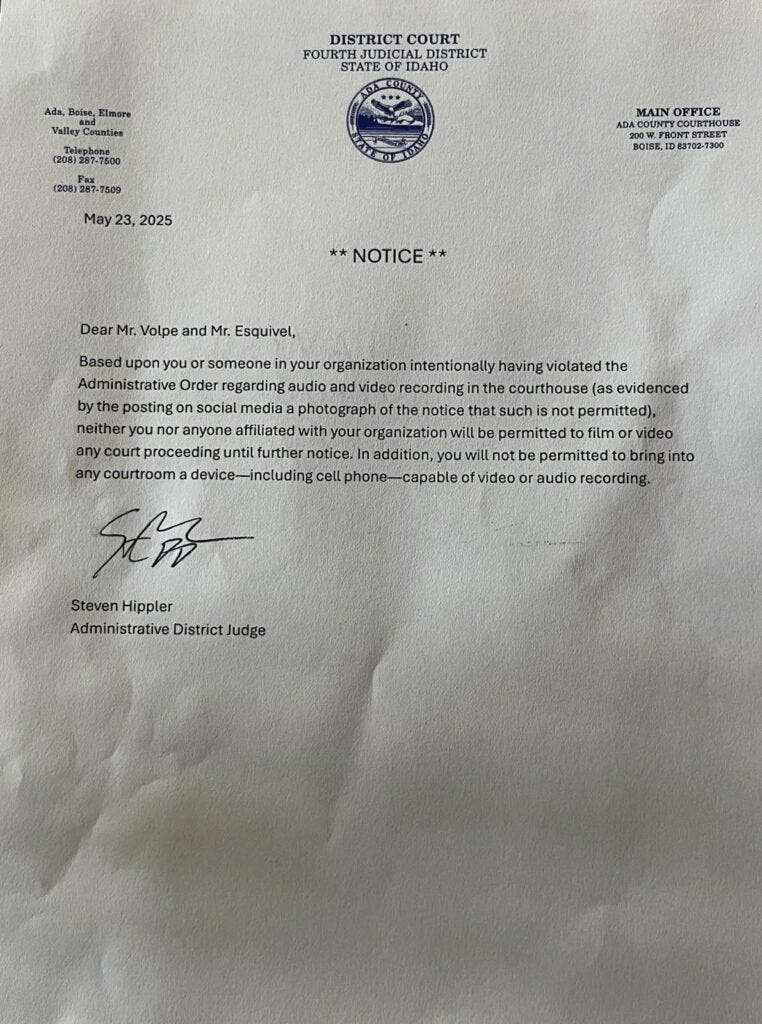 Volpe read it aloud, emphasizing how swiftly the Idaho judiciary moved to muzzle an outsider who caught them in the act of secrecy. He wasn’t intimidated – in fact, he took it as a badge of honor.