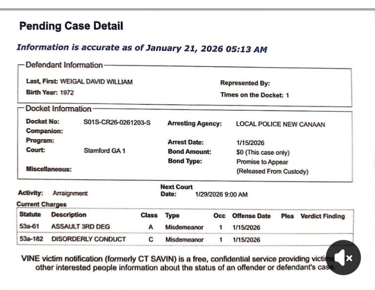 The docket lists the New Canaan Police Department as the arresting agency. Weigel says the department never arrested him. He says the department later dressed a non-summons as an arrest. The “Johnny-come-lately” Class A misdemeanor action is politically motivated and part of a coordinated pressure campaign against Weigel.