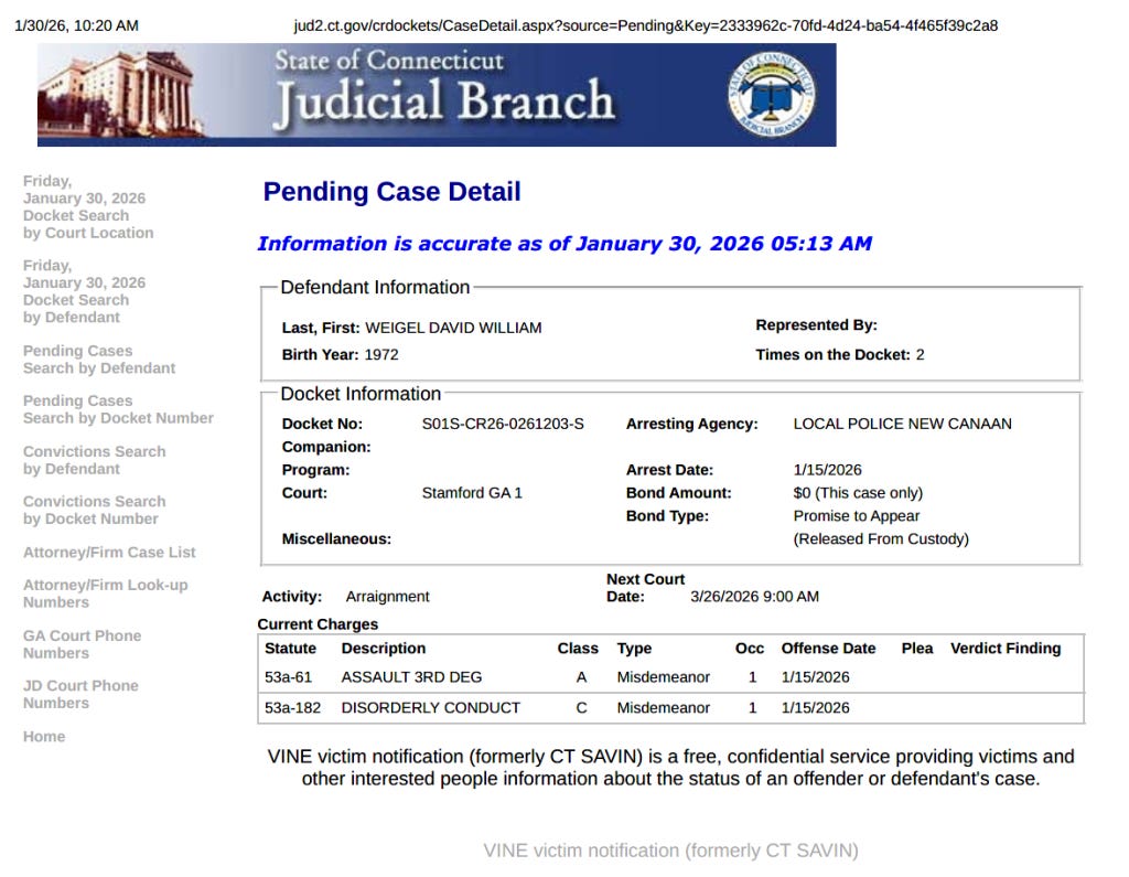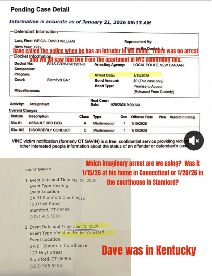 A court events listing shows “Violation Notice Arrested” on January 20, 2026. Stamford courthouse. Hoyt Street. Weigel’s fraud warrior camp calls that a phantom arrest marker. They say no officer took him into custody. They say no one served a desk appearance ticket on January 20.