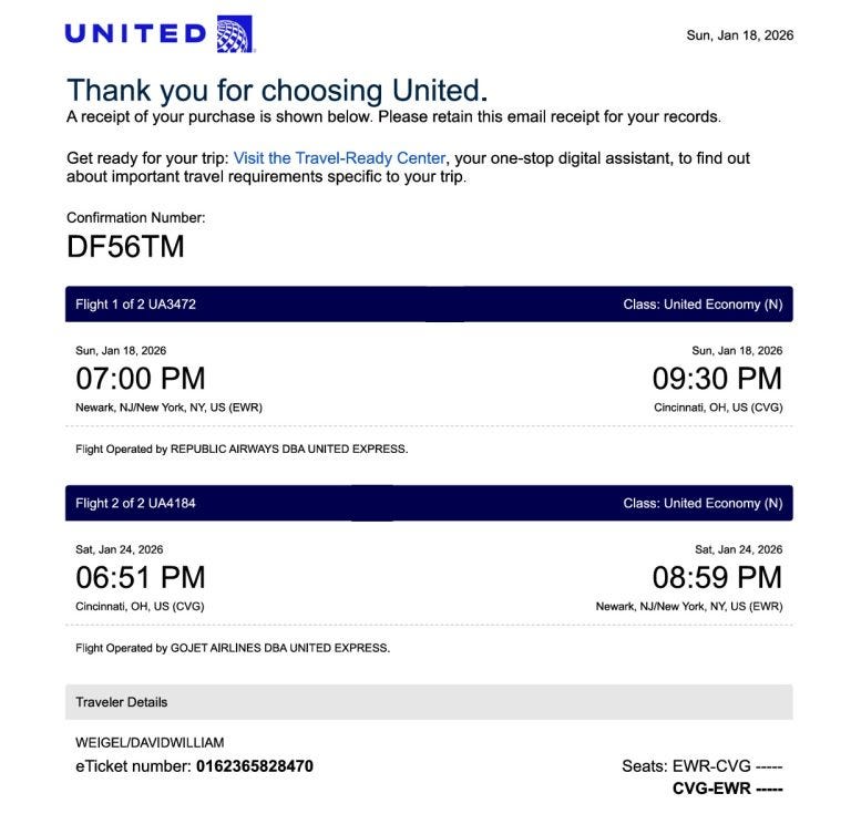 Why? Because Weigel was not even in Connecticut on that date, he points to a United Airlines receipt in the file. The same receipt shows a late-January return through Cincinnati.