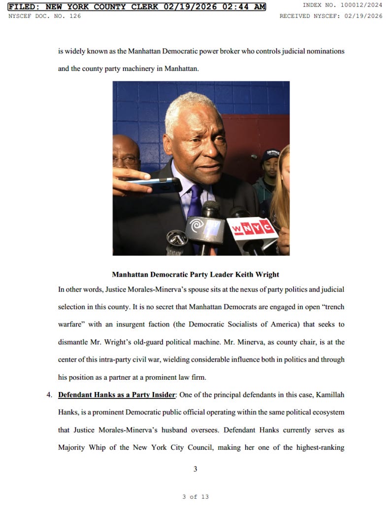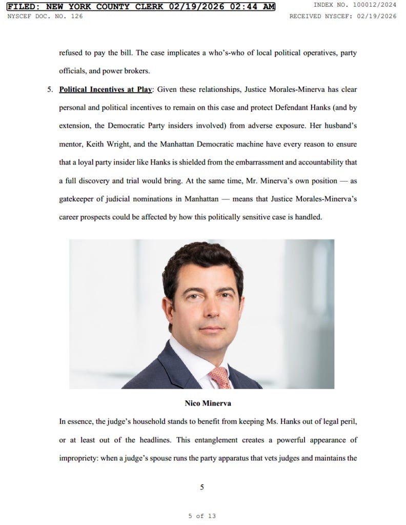Enter Justice Emily Morales-Minerva – and yet another conflict of interest. She’s the judge currently presiding over Luthmann v. Hanks, but she also happens to be married to Domenico “Nico” Minerva, the Manhattan Democrat Party chair, a “longtime lieutenant” of party boss Keith L. Wright, and a partner at Labaton Keller Sucharow LLP.